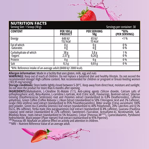 - Μαλτοδεξτρίνη: Γρήγορα αφομοιώσιμη πηγή ενέργειας που παρέχει άμεση ώθηση πριν και κατά τη διάρκεια της προπόνησης.