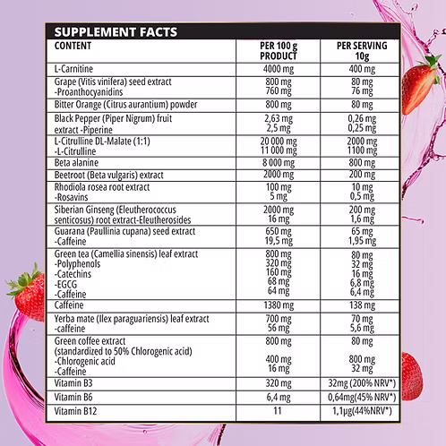 - Εκχυλίσματα πάσινου τσαγιού, γκουαράνα και γιέρμπα μάτε: Πλούσια σε αντιοξειδωτικά, προστατεύουν τα κύτταρα από βλάβες και βελτιώνουν τη φυσική απόδοση και αντοχή.
